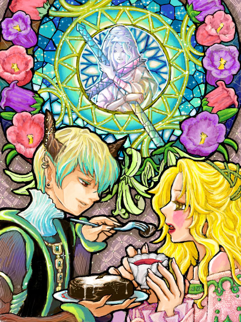 この絵のシチュエーションとしては、聖バレンタインのステンドグラスの下、悪魔っ子がデビルケーキをフォークに一口刺して、天使ちゃんに食べさせる(寸前)というもの。